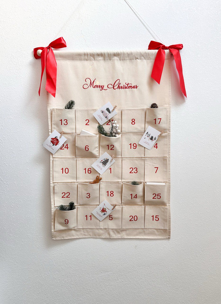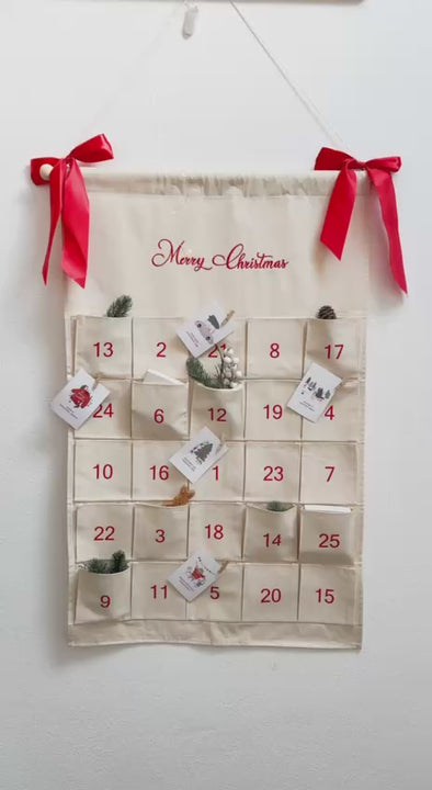 Crafted from durable natural canvas and available with optional embroidered name personalization, this reusable Christmas countdown wall hanging features 25 numbered pockets, perfect for small treats, notes, or activity cards.